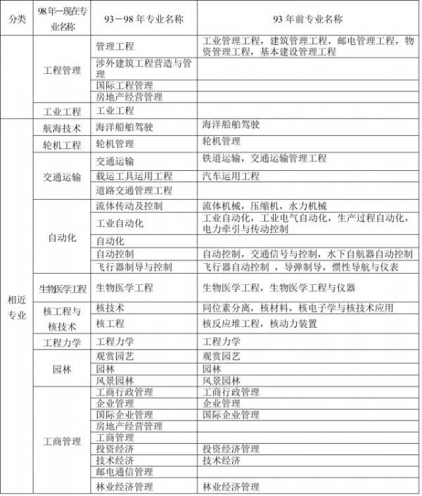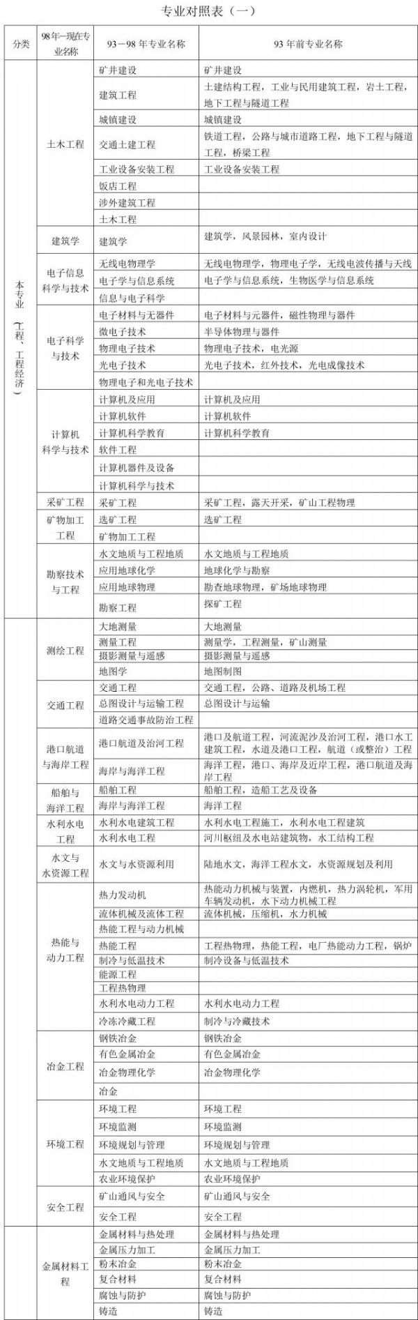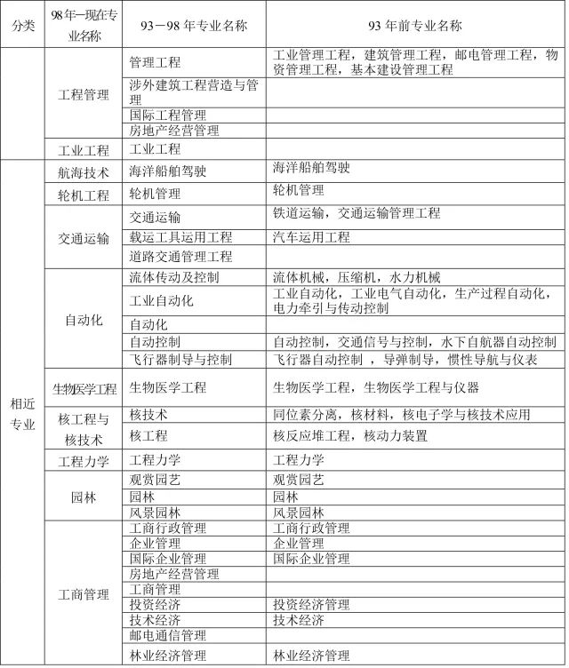 3、 為便于考核認定條件中有關(guān)專業(yè)學歷的確認,對“本專業(yè)”、“相近專業(yè)”和“其他專業(yè)”進行了劃分,供申報和審核考核認定條件時參考。其他專業(yè)的具體范圍由建設(shè)部、人事部確認。