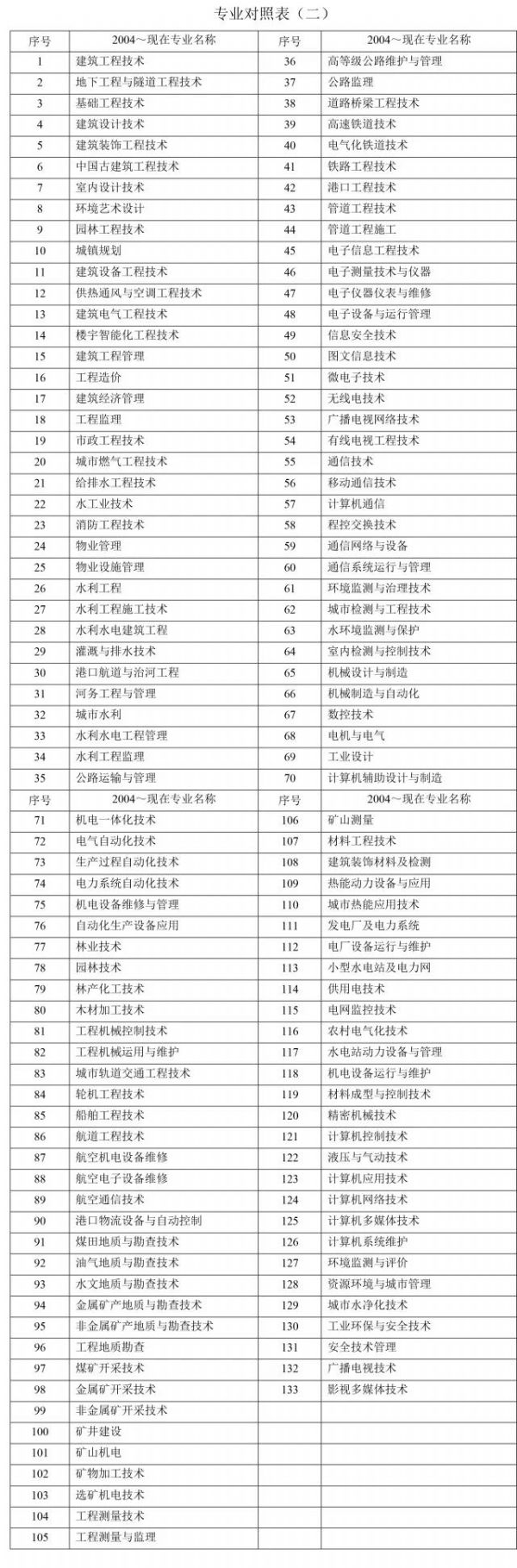 注:本表按教育部現(xiàn)行《普通高等學校高職高專教育指導性專業(yè)目錄(2005年版)》編制。共涉及“土建施工類、工程管理類、建筑設(shè)計類、城鎮(zhèn)規(guī)劃與管理類、建筑設(shè)備類、市政工程類、房地產(chǎn)類、水利工程與管理類、機械設(shè)計制造類、自動化類、電子信息類、通訊類、環(huán)保類、機電設(shè)備類、公路運輸類、鐵路運輸類、港口運輸類、管道運輸類、林業(yè)技術(shù)類、城市軌道運輸類、水上運輸類、民用運輸類、資源勘查類、水利水電設(shè)備類、地質(zhì)工程與技術(shù)類、礦冶工程類、礦物加工類、測繪類、材料類、能源類、電力技術(shù)、計算機類、安全類、廣播影視類”等34類133個專業(yè),其中本專業(yè)76個,相近專業(yè)57個。